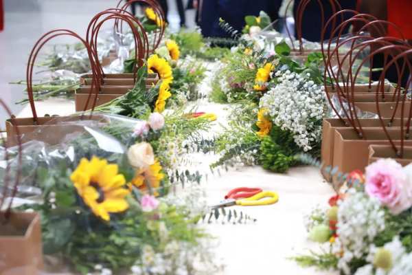 现场插花环节,“女神”们拿起喜欢的花朵,认真构思,修剪枝叶,搭配色彩,兴致勃勃地创作,热烈地相互交流,现场充满欢声笑语。