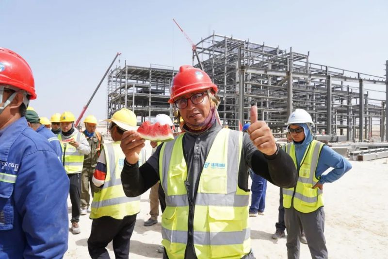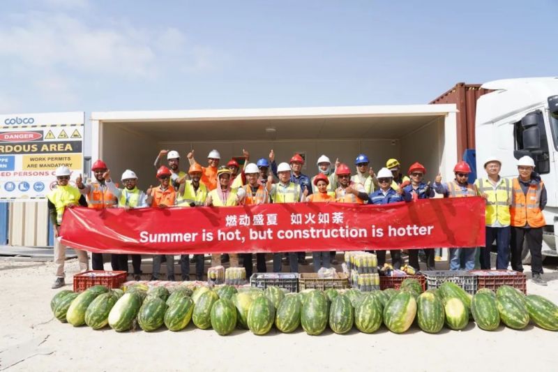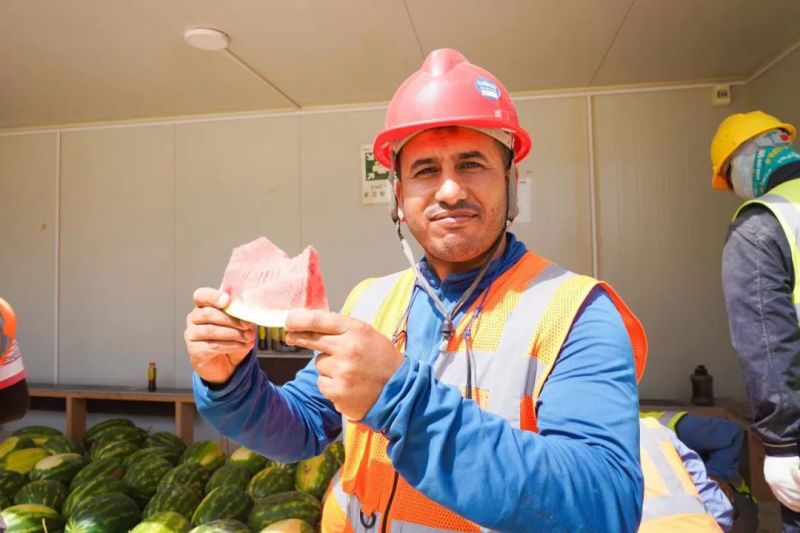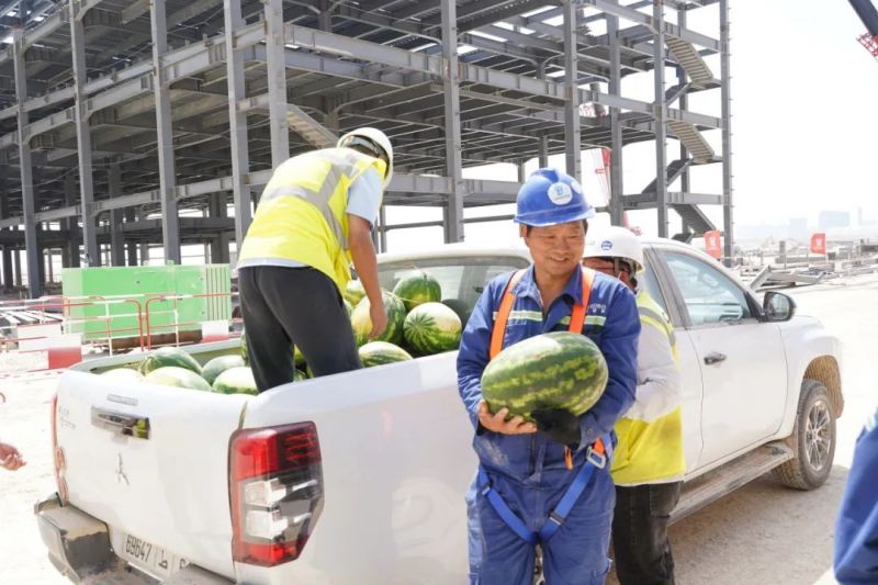 尽管高温炙烤,项目现场的工人们仍坚守一线、不畏酷暑、辛勤工作,确保工程建设的顺利进行。此次,摩洛哥项目组为施工人员准备了500瓶酸奶、500瓶凉茶、2000斤西瓜等防暑降温物品,按各单位人数送至施工现场分配发放。