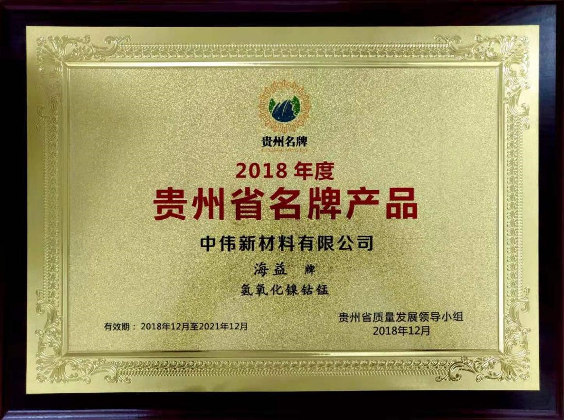 9月5日,在贵州铜仁市,当地质量发展领导小组对荣获2018年度“贵州省名牌产品”称号企业进行授牌。颁奖仪式上,taptap点点官网新材料凭借海益牌氢氧化镍钴锰产品获此殊荣,这是对企业产品的高度肯定。
