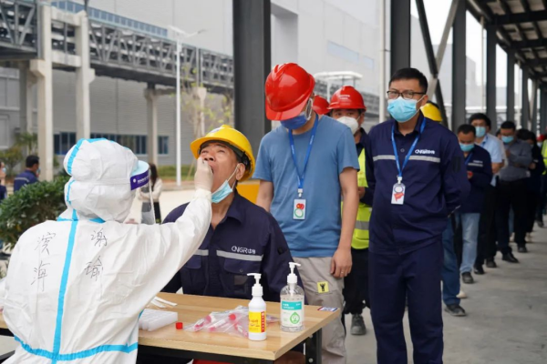 与此同时,基地严格要求进入厂区人员全天佩戴口罩、接受体温检测、两码核对,积极与政府部门对接,在公司设立核酸检测点,每日组织全员核酸检测工作,确保防疫、生产两不误。在这场没有硝烟的疫情防控阻击战中,南部产业基地涌现出了一批奋战在抗疫一线的“逆行者”,这支由公司党员组成的志愿先锋队主动请缨,协助医务人员完成核酸检测信息录入等相关工作。在9天的时间里,他们奋战在核酸检测一线,每天辅助核酸检测4000余人/次,凭借积极主动、细致热忱、调度高效的服务,得到了医护人员和全体员工的一致称赞。